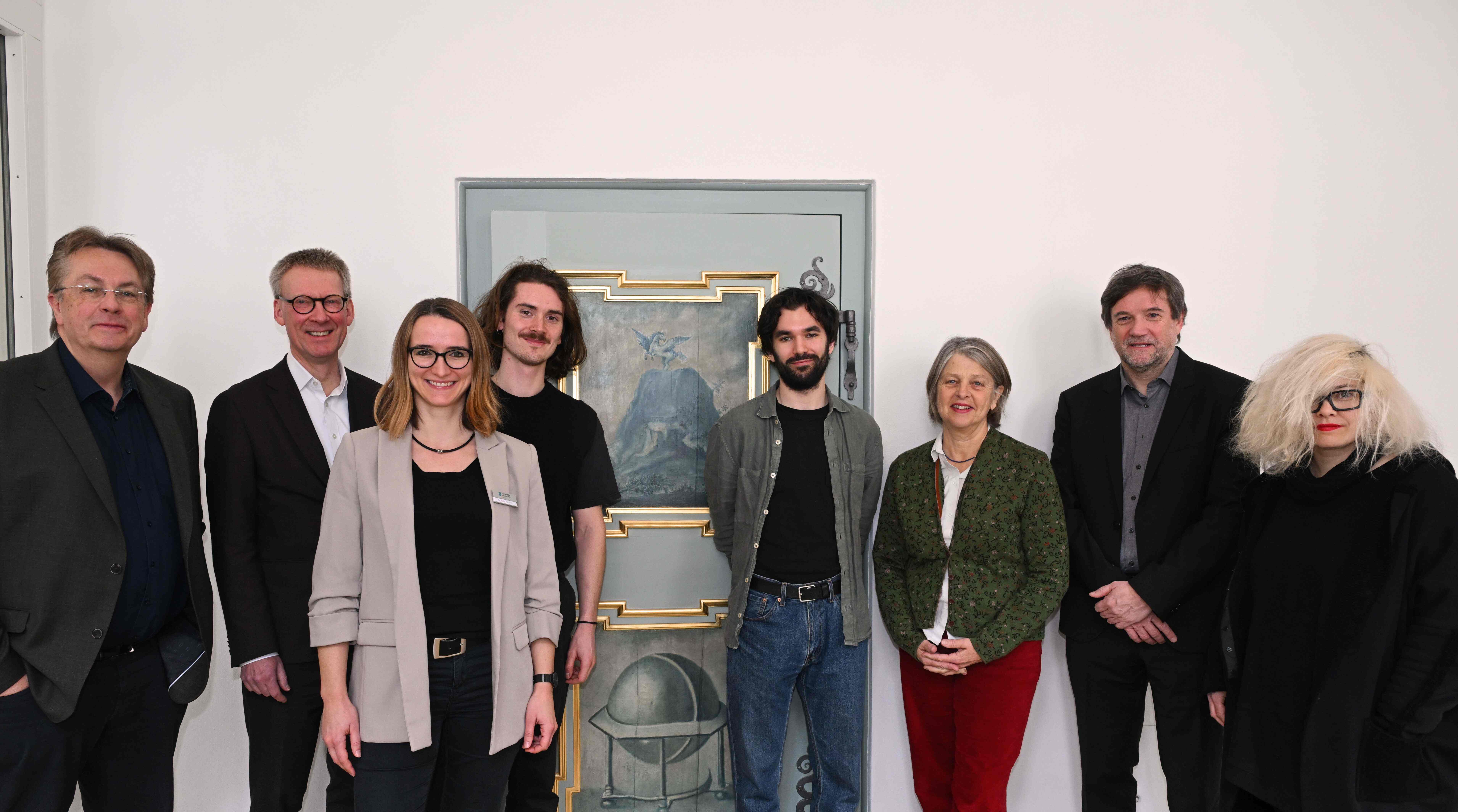 V.r.n.l. Jurymitglied Dr. Thomas Kraft, Geschäftsleiter Schwabenakademie Dr. Stefan Raueiser, Studienleiterin Schwabenakademie Dr. Nadja Hendriks, Jurypreisträger Lukas Arndt, Autorenpreisträger Konstantin Schmidtbauer, stellv. Bezirkstagspräsidentin Barbara Holzmann, Jurymitglied Markus Orths und Jurymitglied Daniela Seel.